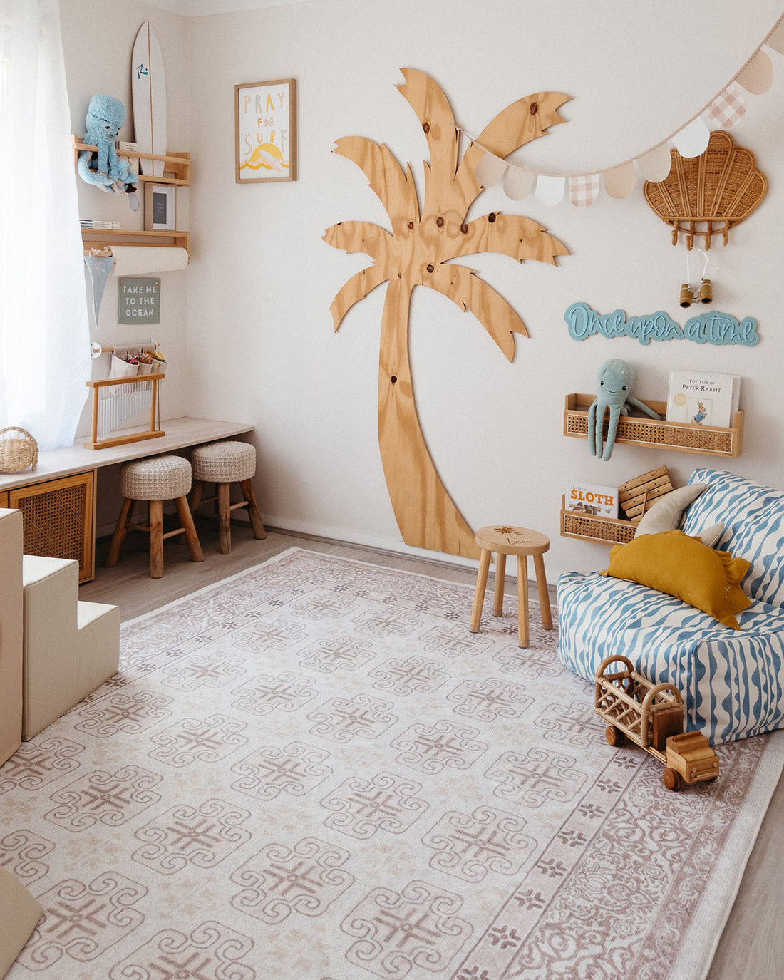 A rug introduces warmth and softness underfoot. Position it two-thirds under the bed, allowing it to extend beyond the sides and foot.