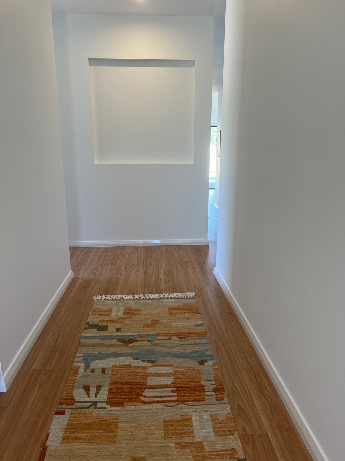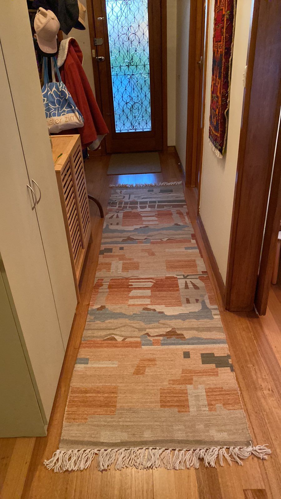 Allegra is a stunning multi-colour PET runner rug with a brown cream background topped with a warm modern palette of orange, blue and green tones.