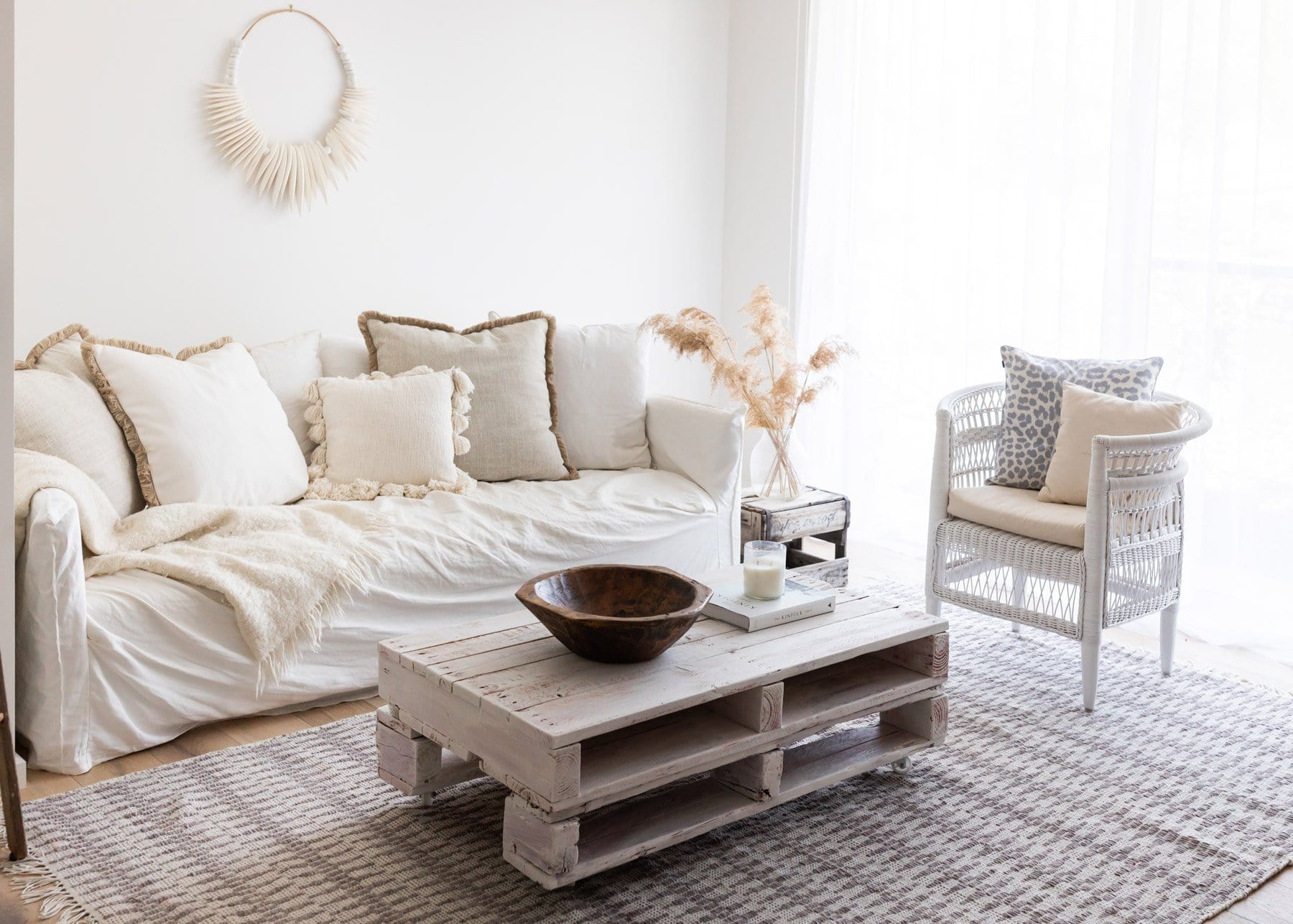 Position your rug to frame the seating area as one considered zone. Place at least the front legs of your sofa and chairs on the rug to anchor the layout.
