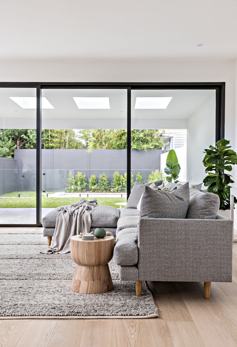 Position your rug to frame the seating area as one considered zone. Place at least the front legs of your sofa and chairs on the rug to anchor the layout.