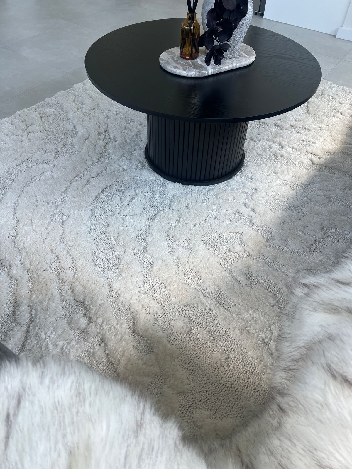Aurora is a beautiful warm-based ivory and cream rug with a carved abstract waved pattern made from a high low pile variation.