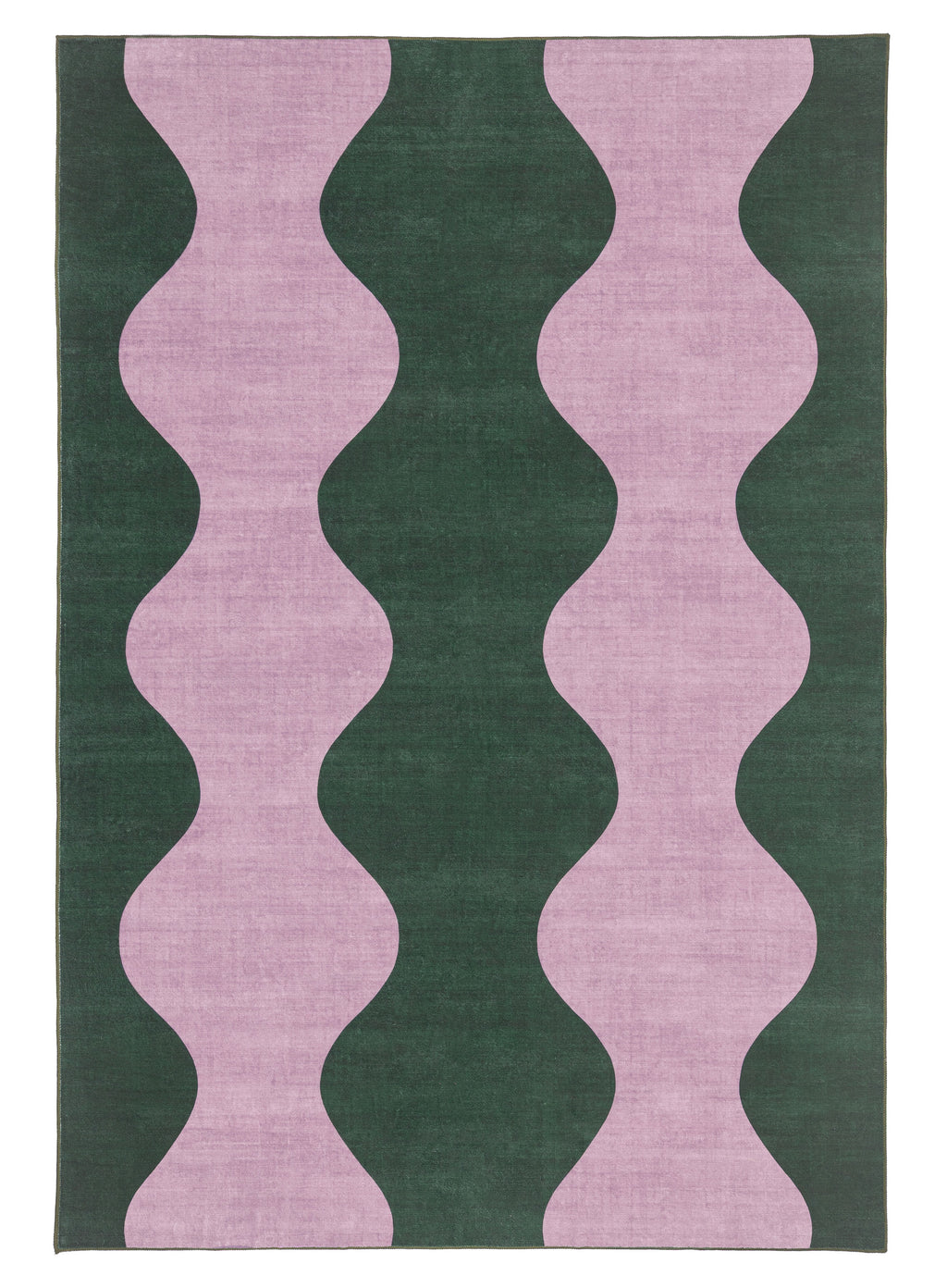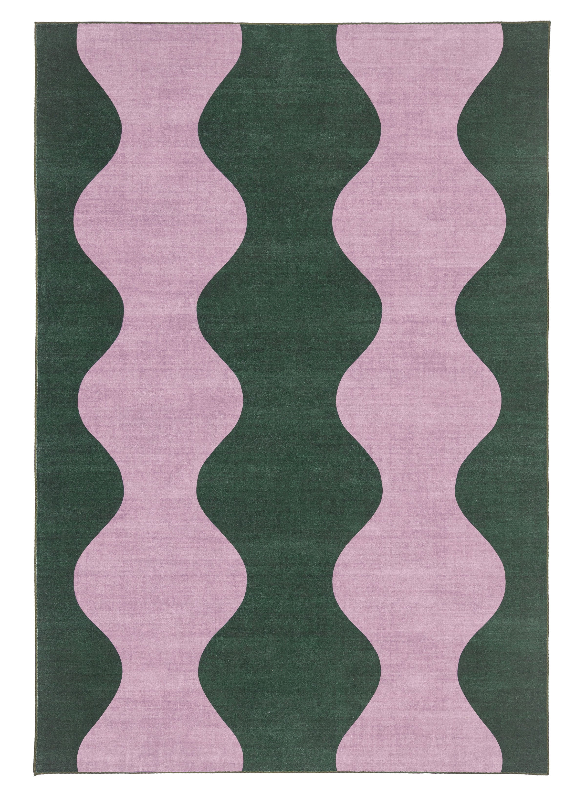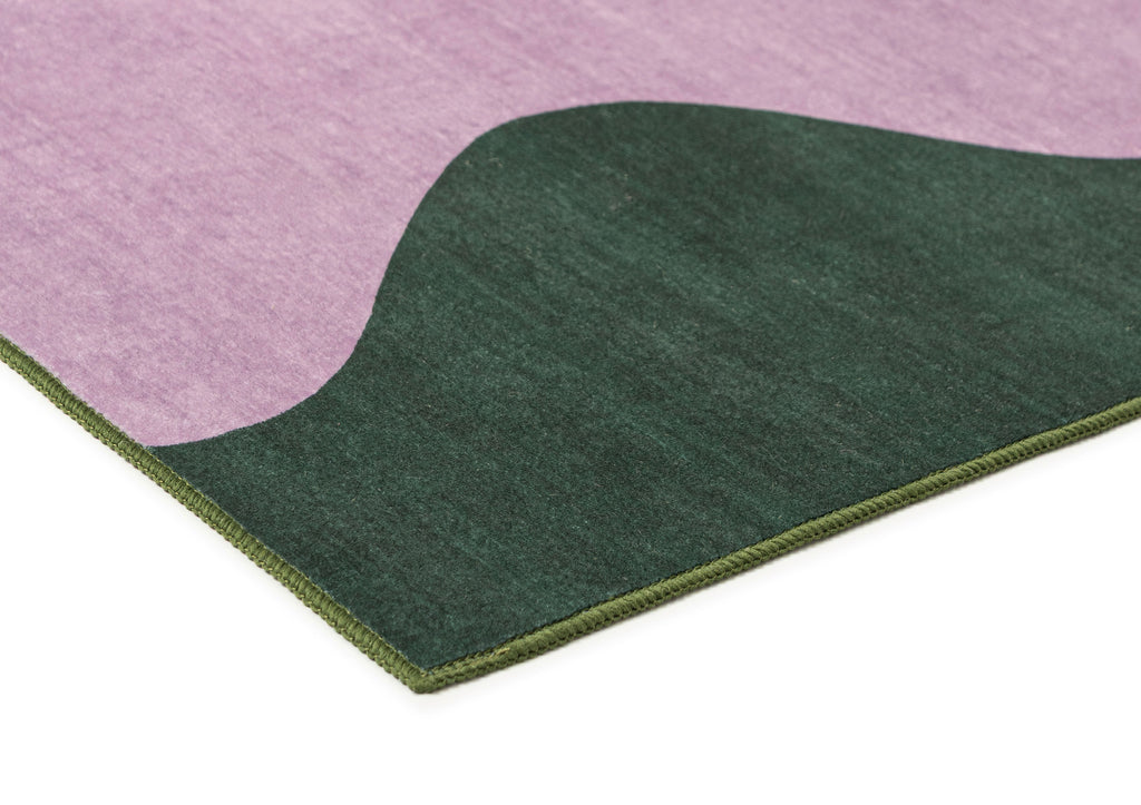 Cuenca is a washable and foldable rug defined by a flowing wave motif that brings a sense of movement and softness to a space. A warm green base is layered with soft purple curves, creating a rhythmic pattern that adds movement and visual interest to the space.