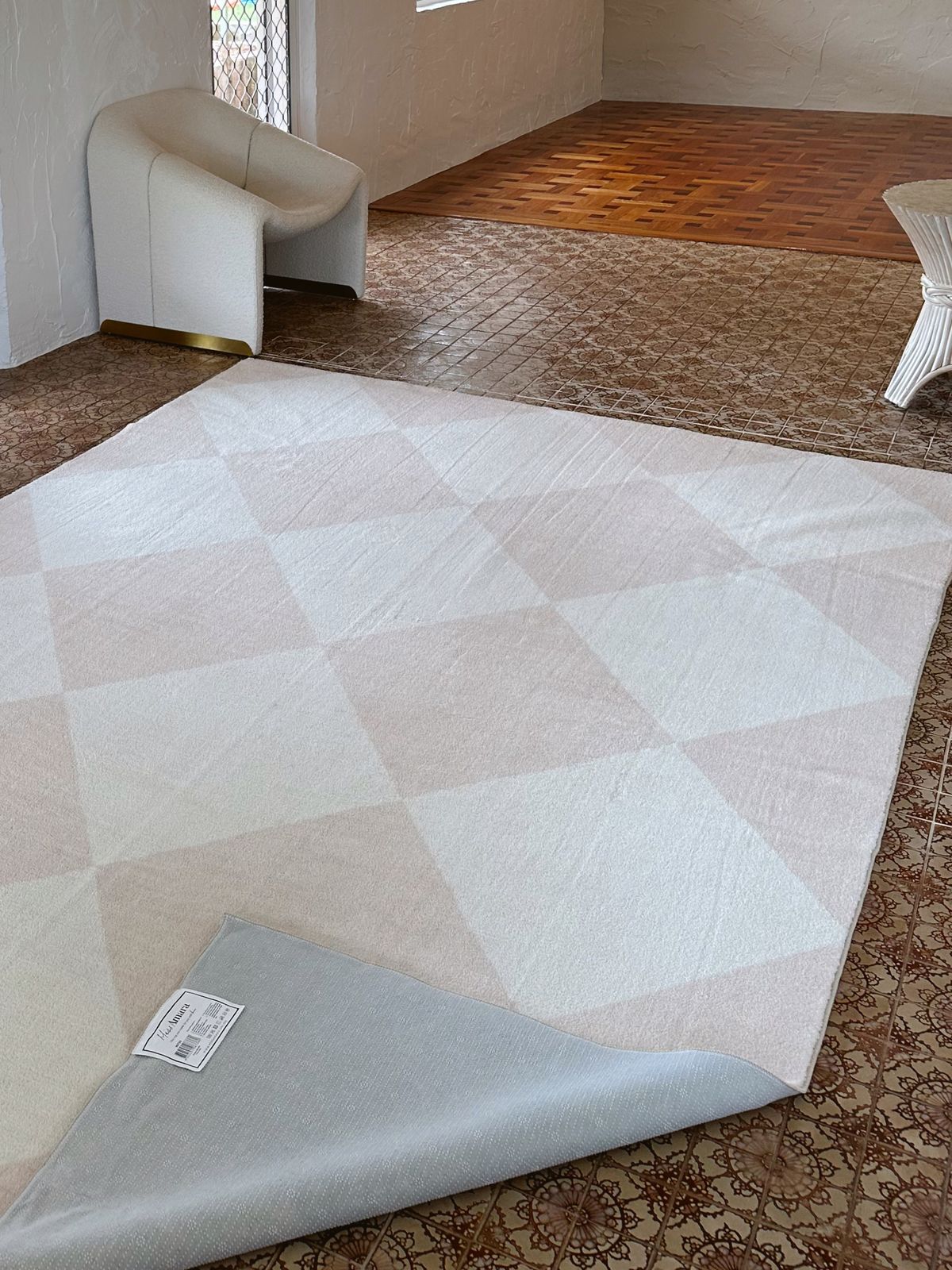 Doutzen is a beautiful soft plush machine washable and foldable rug featuring a checkered pattern in neutral beige and cream tones.