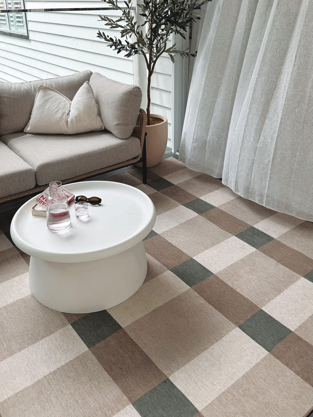 Forio is a modern indoor outdoor rug featuring an oversized check pattern in warm beige, soft ivory, and earthy olive green.