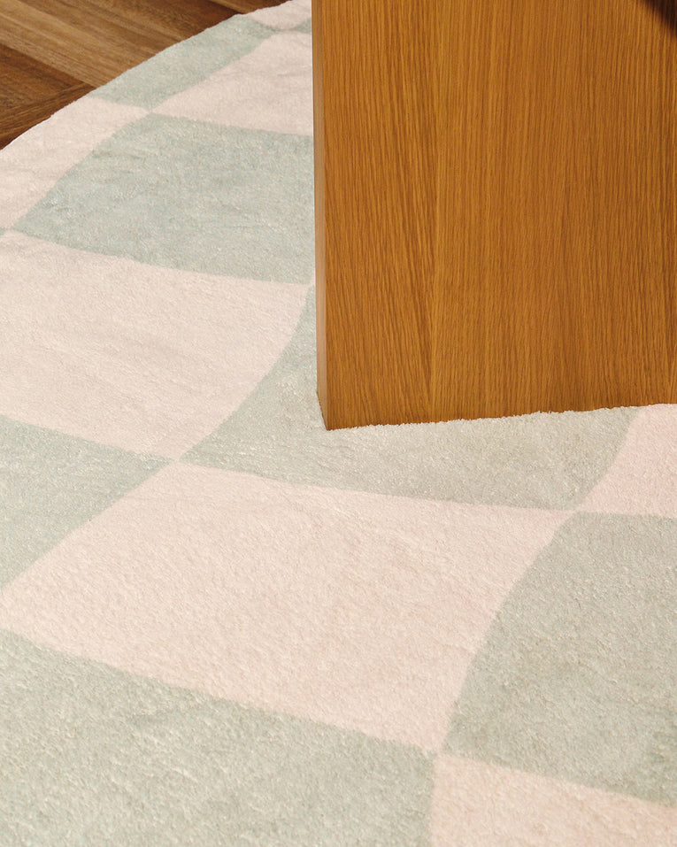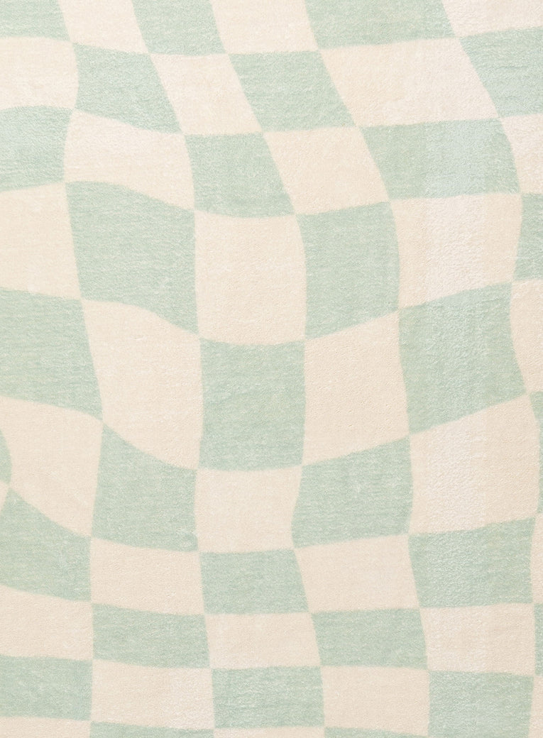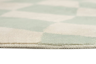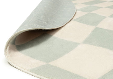 Illena is a stunning washable and foldable rug featuring an abstract checkered pattern in green on an ivory base. A fun, modern and unique design to add to any space.