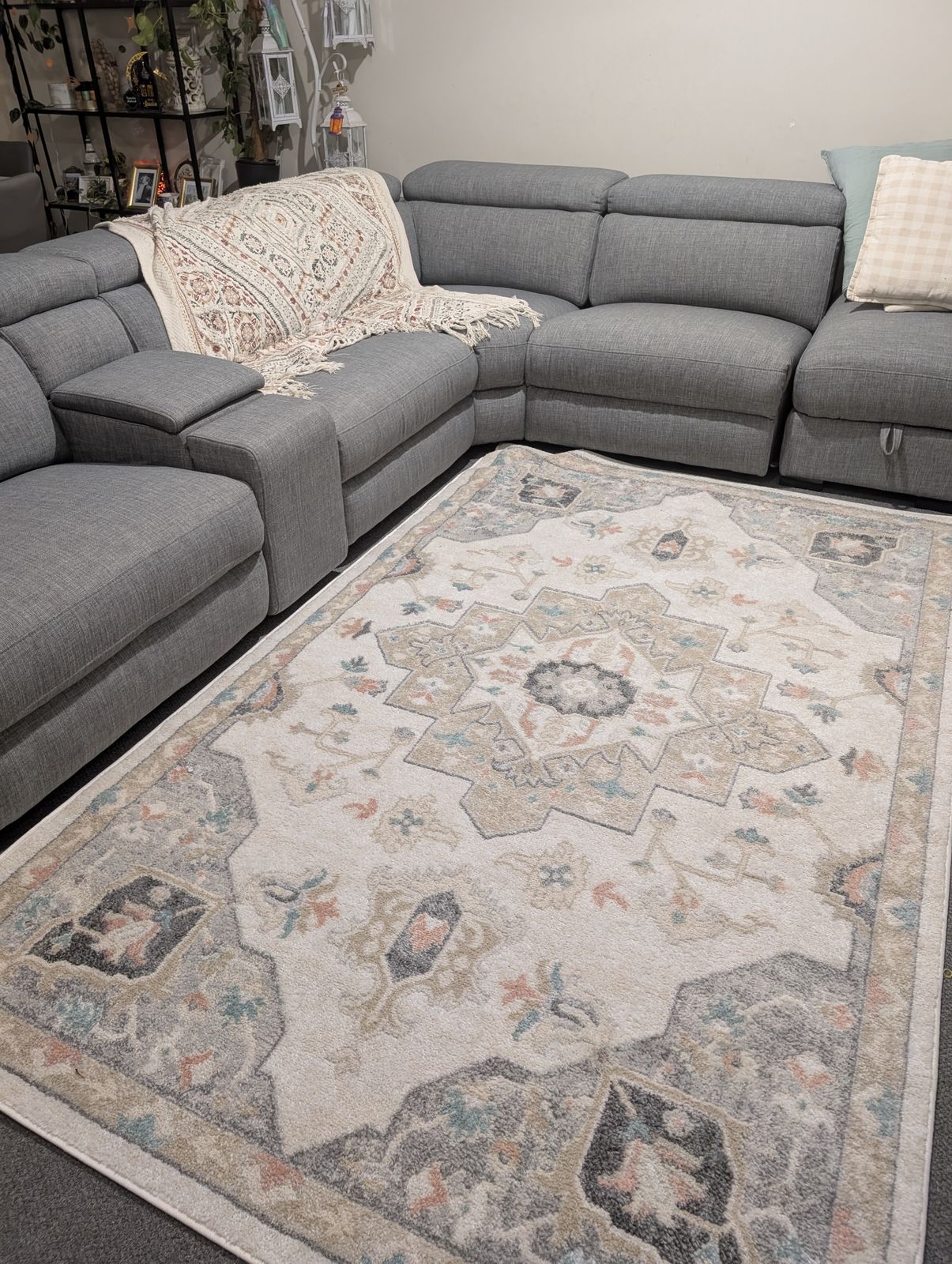 Ingrid is a stunning blend of cream and ivory with a traditional style floral design rug with a muted palette of grey, blue and pink.