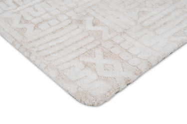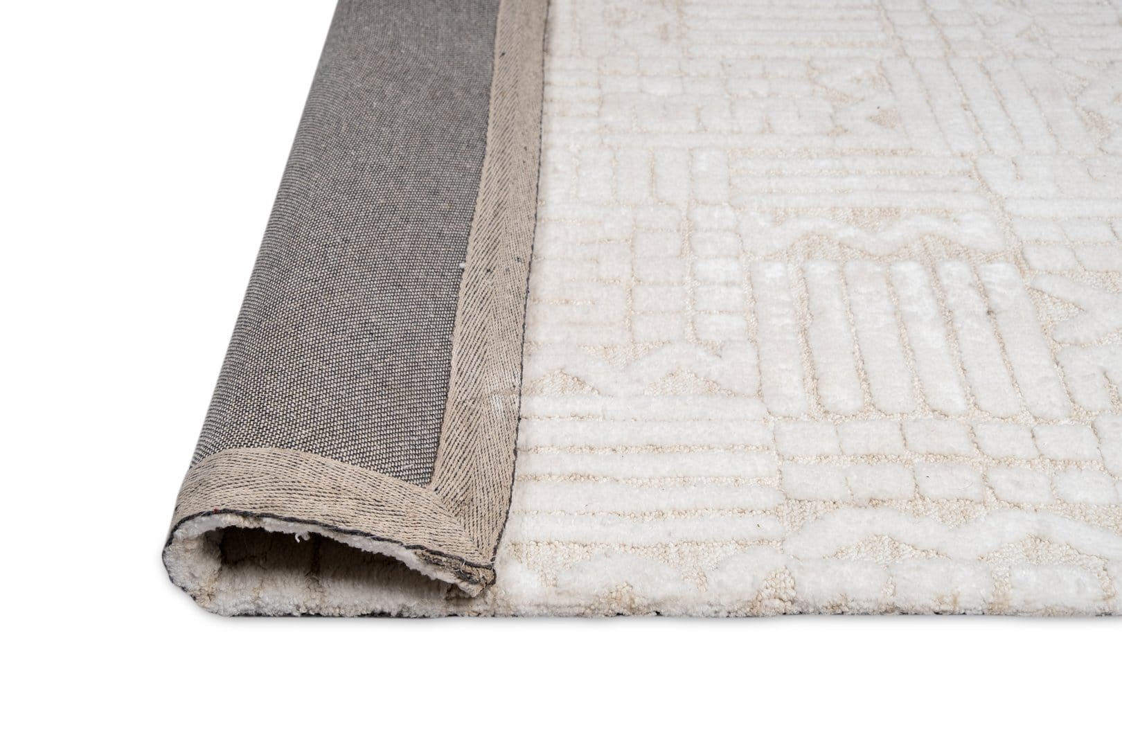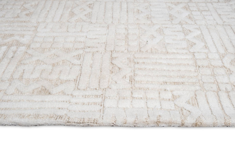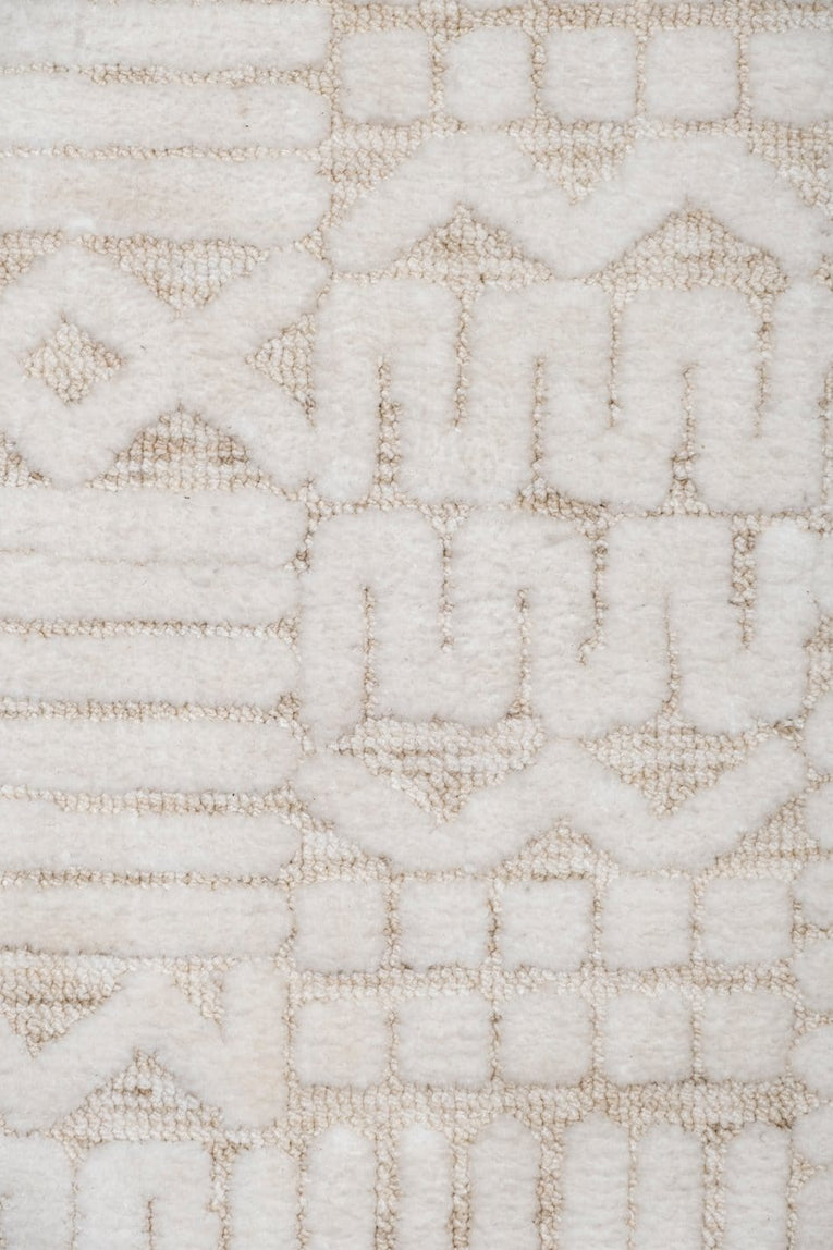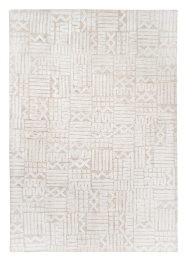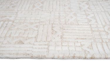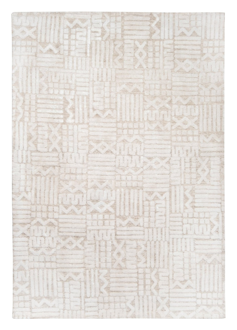 Kalinda is a stunning transitional warm beige and ivory rug crafted with a unique textured high-low tribal print.