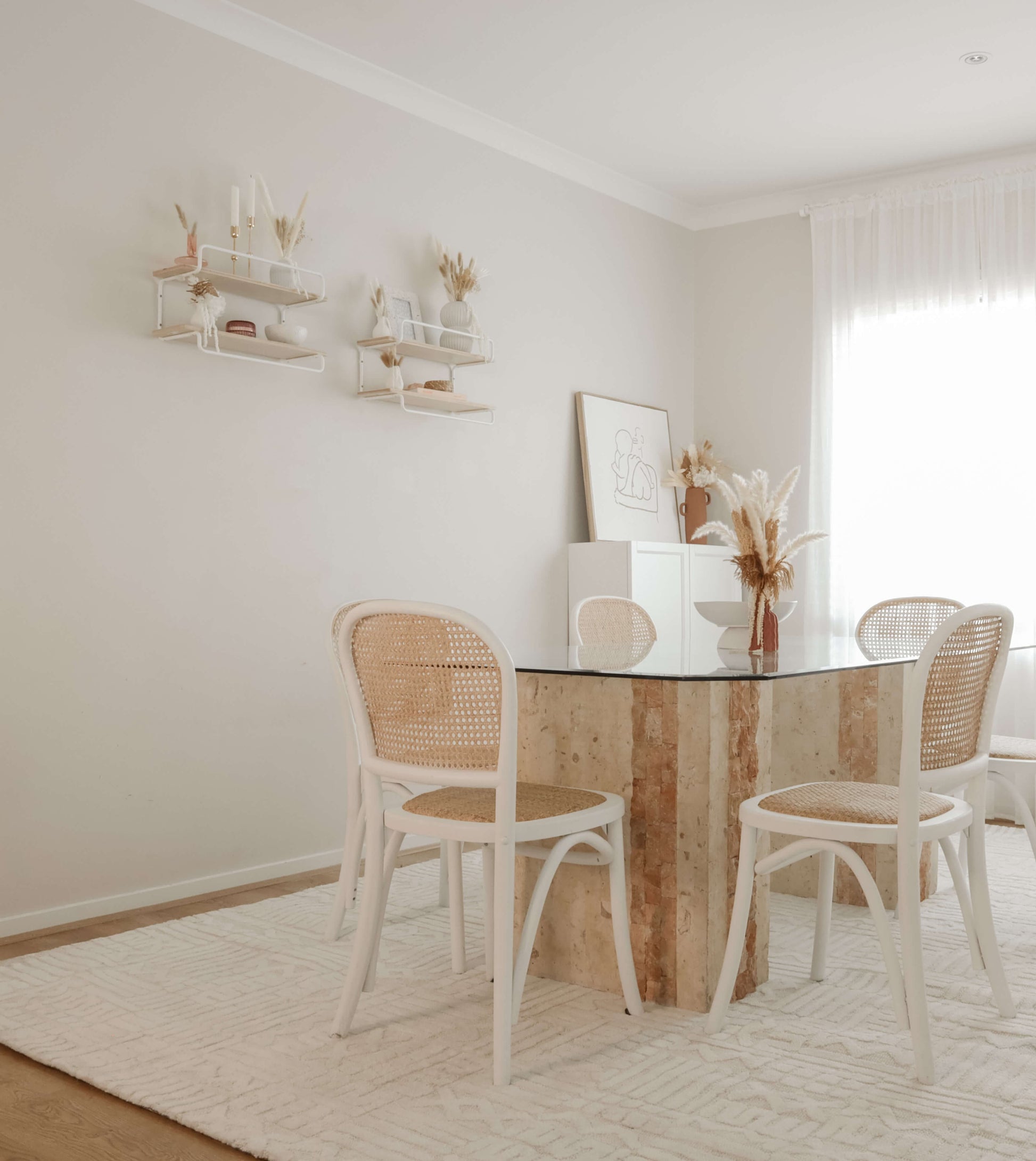 Your rug should sit fully beneath the table and chairs, even when chairs are pulled out.