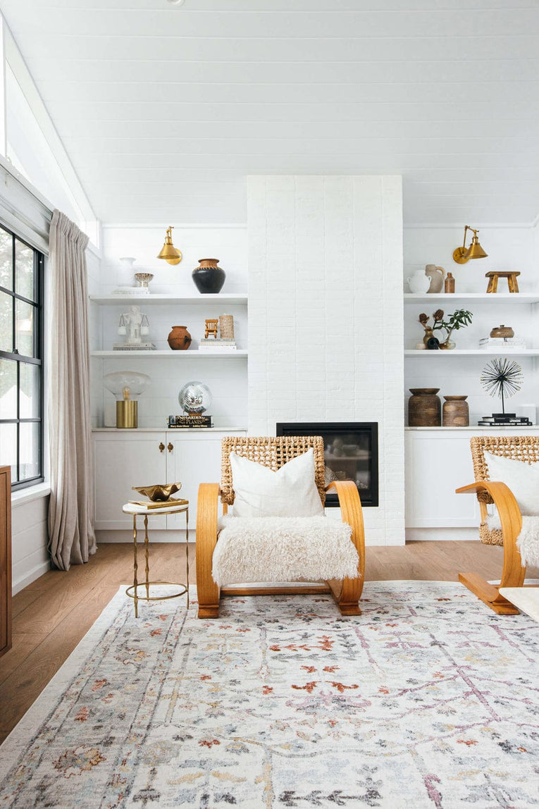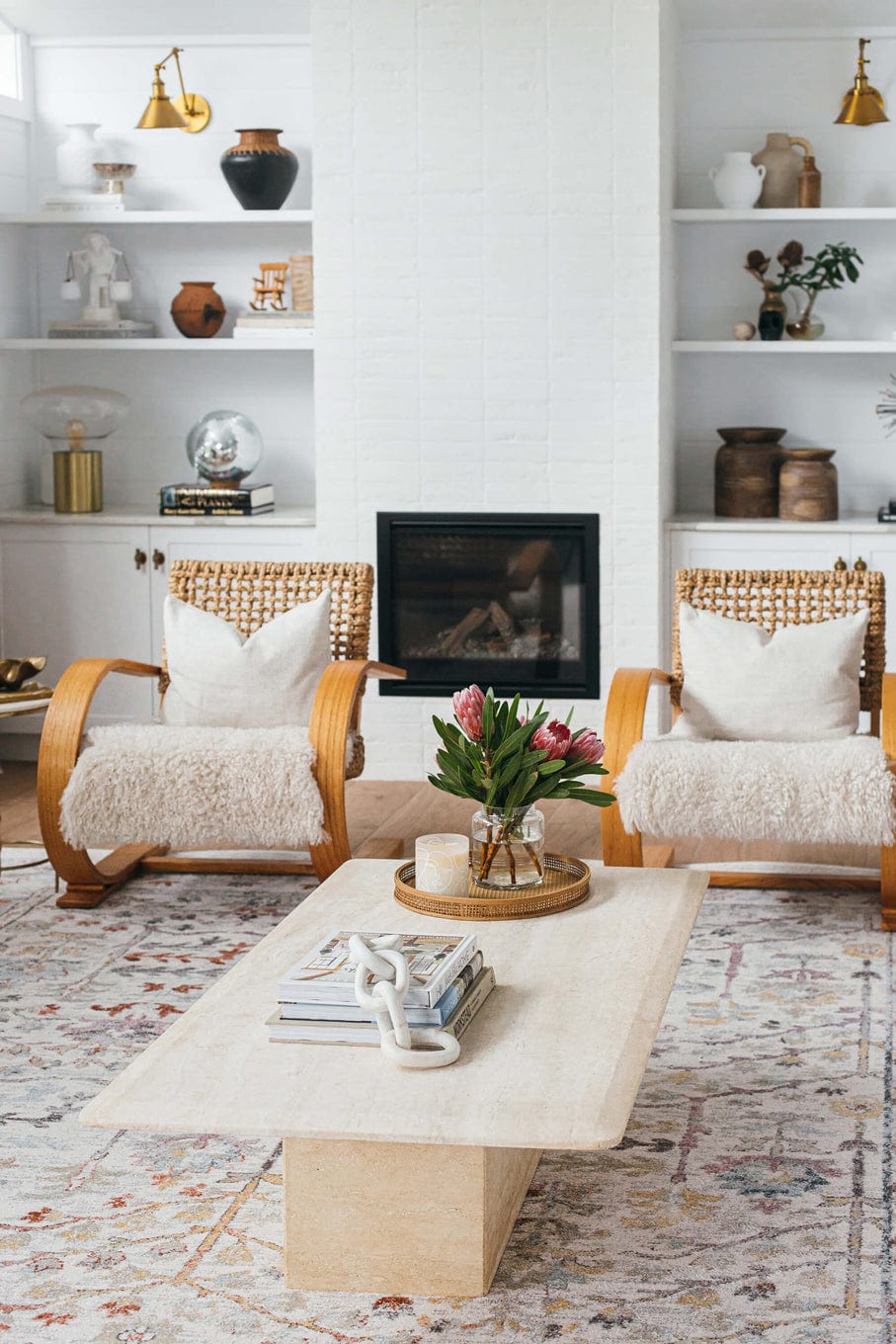 Position your rug to frame the seating area as one considered zone. Place at least the front legs of your sofa and chairs on the rug to anchor the layout.