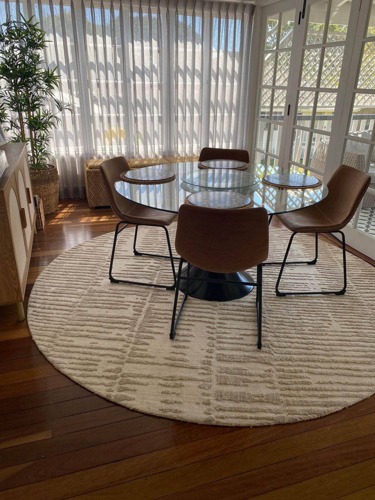 So glad I found a wide enough rug that a chair stays on once you push it out from the table. Feels great under foot too!