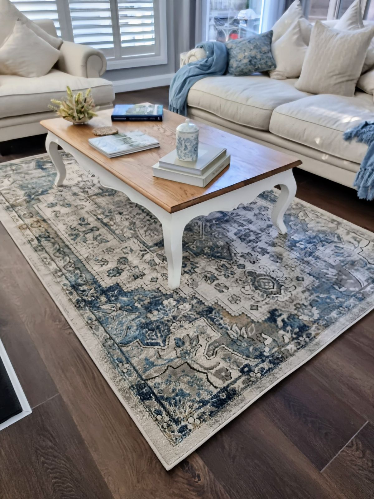 An exclusive design in the Miss Amara Collection, Rhona features a distressed look to give it a vintage feel. Decorated with elaborate floral motifs and ornate patterns in transitional tones of blue, grey and ivory with hints of beige. A timeless and elegant addition to a modern, classic, bohemian or vintage space.
