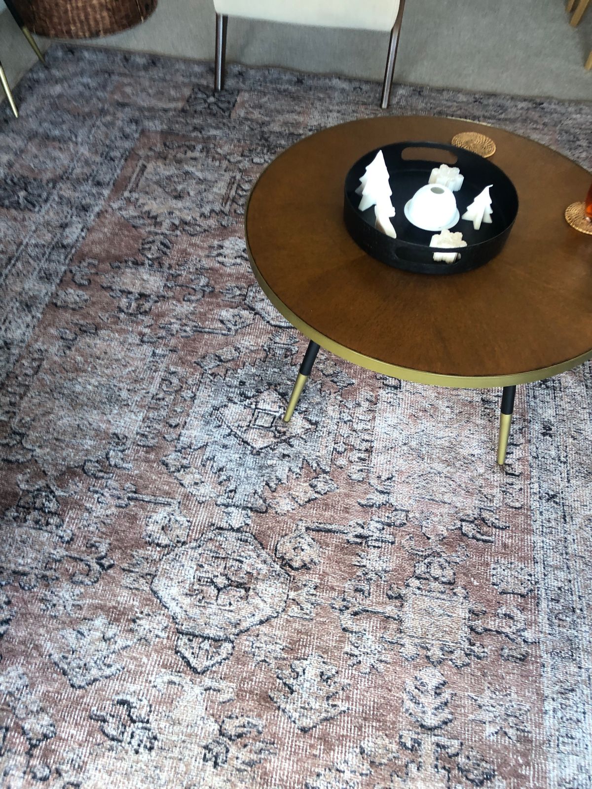 I originally bought a washable rug from another company and had to return it as it was so thin and plastic. I found this Miss Amara rug online and I am so happy with it. It is very soft to the touch and has a lovely mix of colours. I needed both a warm grey and some rust in a rug so this was perfect. It has a faded vintage vibe to it and looks quite authentic. I’m not sure if it will fit in my washing machine but at least I can be assured that I can give it a good scrubbing if my puppy goes to town on it!