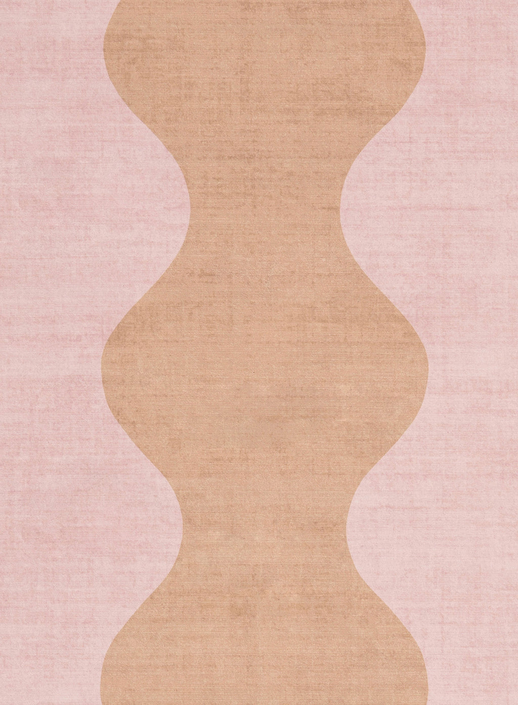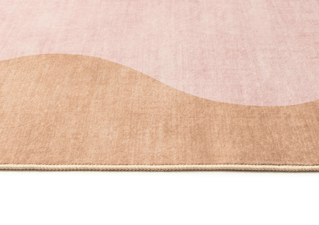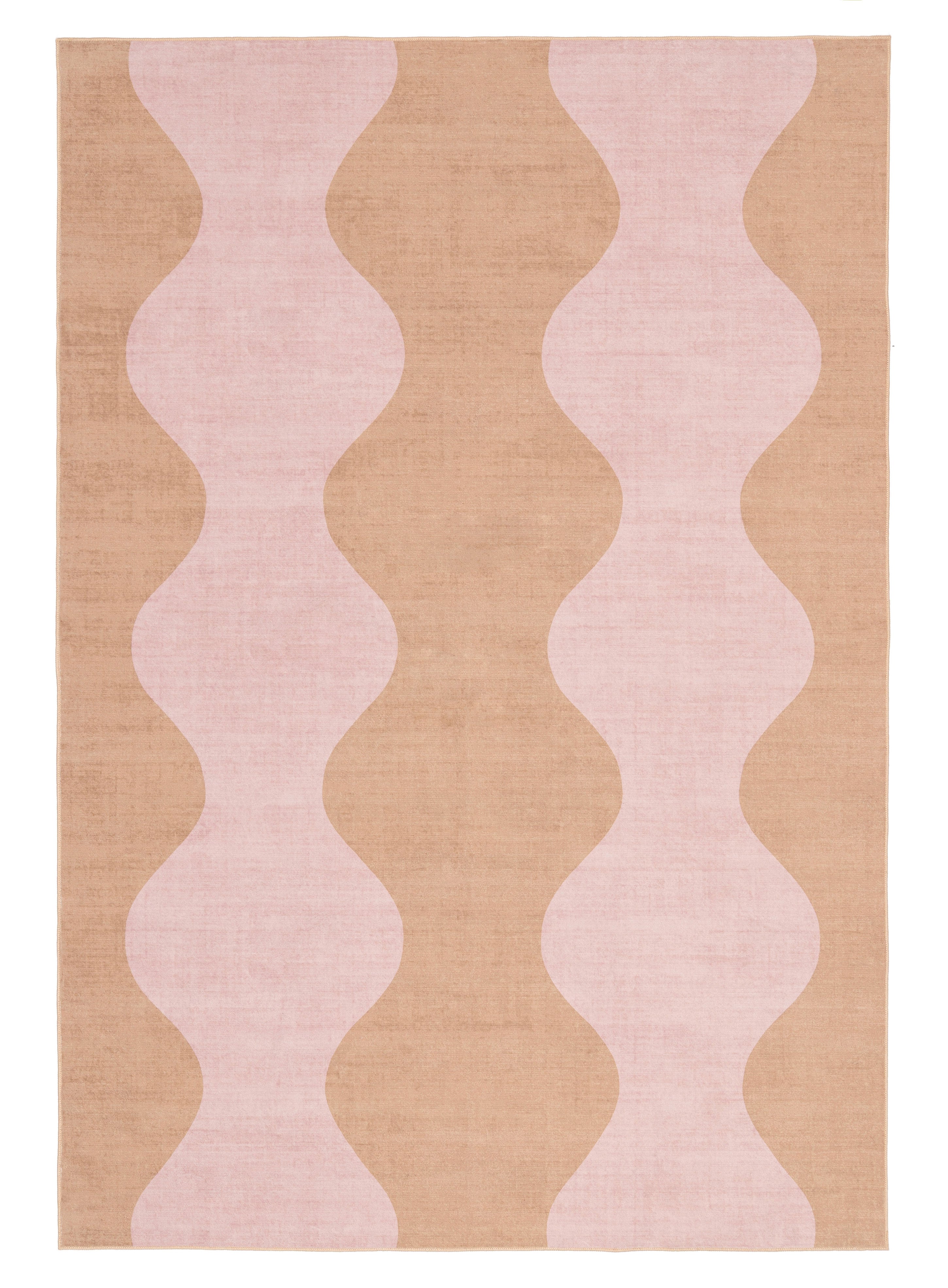 Zamora is a washable and foldable rug defined by a flowing wave motif that brings a sense of movement and softness to a space. A warm beige base is layered with soft pink curves, creating a rhythmic pattern that adds movement and visual interest to the space.